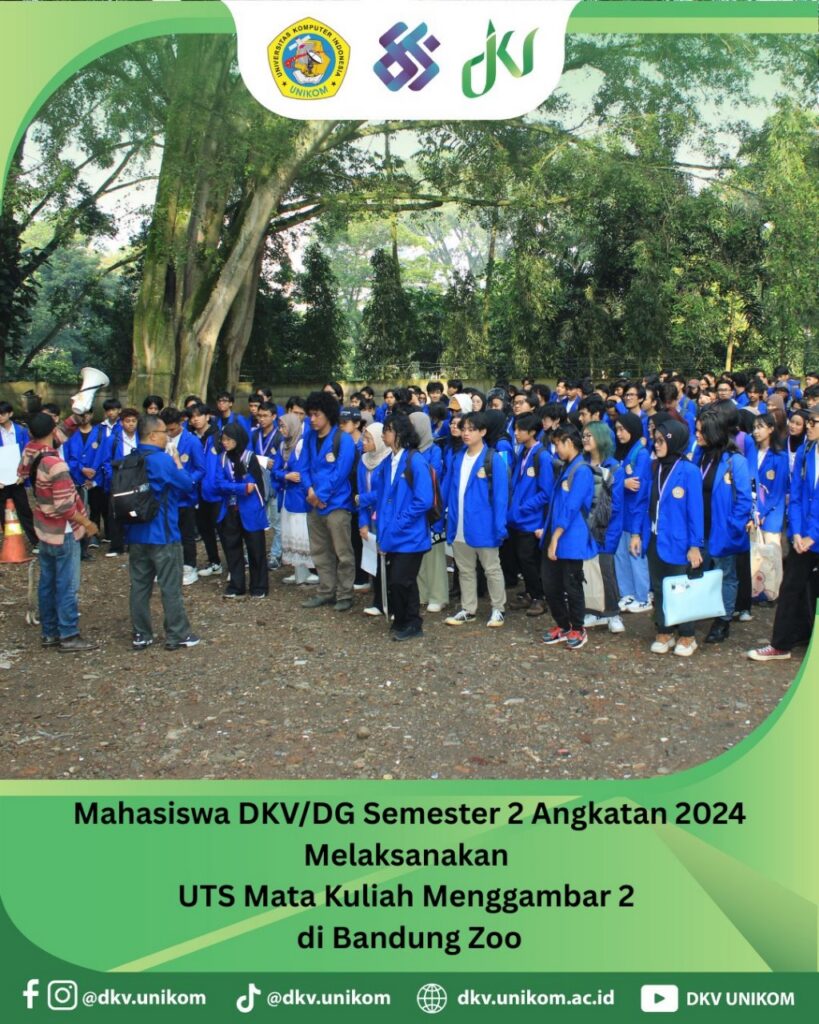 Ujian Tengah Semester yang diadakan di Bandung Zoo ini diikuti oleh seluruh mahasiswa DKV dan DG semester 2 tahun angkatan 2024 dan dosen-dosen pengampu mata kuliah menggambar 2. Dalam Ujian ini Mahasiswa diminta menggambar hewan dengan latar kebun binatang di lokasi dengan media kertas A3 dan teknik yang sudah diajarkan (Teknik Cat air dan Pensil warna).