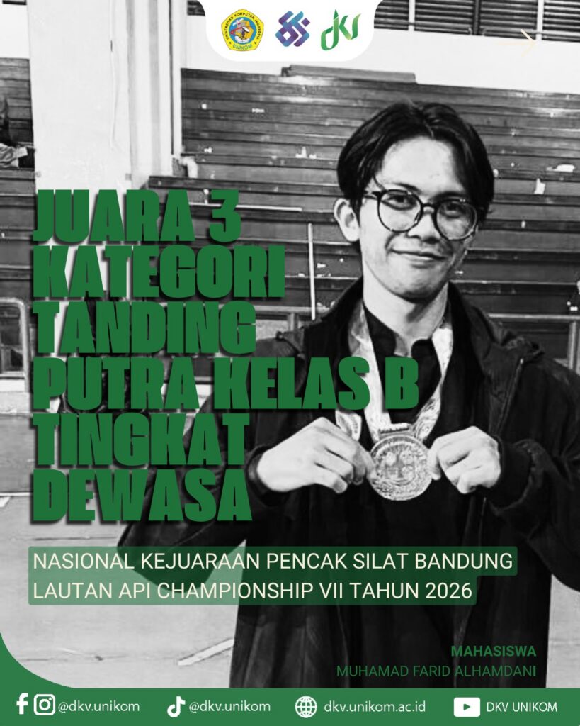 Keluarga Besar Program Studi Desain Komunikasi Visual (DKV) UNIKOM patut berbangga! Ucapan selamat sebesar-besarnya kami tujukan kepada Muhamad Farid Alhamdani atas prestasi gemilang yang berhasil diraih sebagai Juara 3 Nasional Kategori Tanding Putra Kelas B Tingkat Dewasa. Kompetisi bergengsi ini berlangsung pada 24–25 Januari 2026 di GOR Gymnasium Universitas Pendidikan Indonesia (UPI), Bandung, dan menjadi bukti nyata bahwa mahasiswa DKV tidak hanya piawai dalam mengolah visual, tetapi juga memiliki ketangguhan dan disiplin tinggi di bidang olahraga.